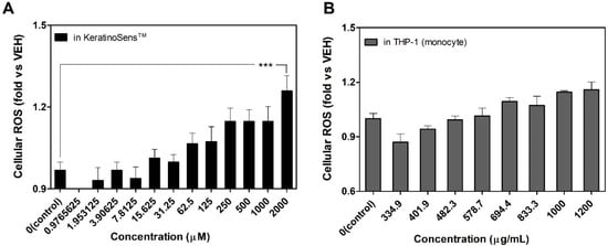 Evaluation of intra-cellular ROS generation treated with silica NPs. The levels of cellular ROS generated in (A) KeratinoSensTM cells and (B) THP-1 cells. Data are expressed as mean ± SEM (n = 4). *** p < 0.0001 compared to vehicle control group. ROS = reactive oxygen species, VEH = vehicle control.