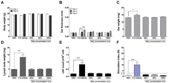 Results of silica NPs skin sensitization potential in LLNA: BrdU-FCM. The dispersed silica NP’s suspension (working concentration: 25, 50, and 100% v/v, respectively), vehicle control (DMF contained 3% mouse serum) and positive control (25% HCA) were applied to the dorsal skin of each ear of the mouse. The evaluation parameters were as follows: (A) Body weight (g), (B) Ear thickness (mm), (C) Ear weight (mg), (D) Lymph node weight (mg), (E) Number of lymph node cell (×107 cells), and (F) Stimulation Index (SI). Data are expressed as mean ± SEM (n = 4). * p < 0.05, *** p < 0.0001 compared to vehicle control group (The ear thickness values were compared on days 1–3 and 3–6 after administration, ** p < 0.001). VEH = vehicle control, P.C = positive control, HCA = hexyl cinnamic aldehyde.