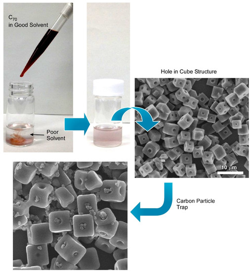 Fabrication of C70 cube with open hole on each face of the cube (hole-in-cube structure) through controlled self-assembly at the liquid–liquid interface and trapping capability for carbon particles. Reprinted with permission from Reference [142]. Copyright 2017 American Chemical Society.