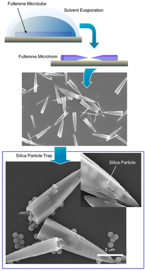 Formation of conical-shaped fullerene microhorn from fullerene microtube and trapping behavior of silica particles. Reprinted with permission from Reference [143]. Copyright 2019 American Chemical Society.