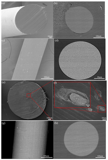 SEM images of the nanocomposite fibers:(a) surface and (b) cross section of PVDF fiber; (c) surface and (d) cross section of PVDF/BT (10 wt%); (e,f) low and higher magnification of cross-section of PVDF/rGO fiber (0.5 wt%) with the low content of graphene nanosheets with the dimension of 200–400 nm; and (g,h) surface and cross section of PVDF/rGO/BT fiber.