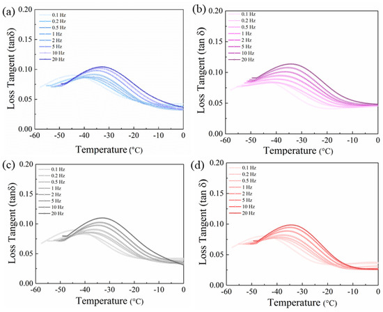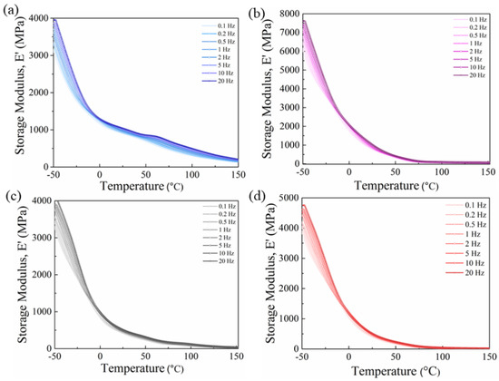 Additionally, E′ decreases based on temperature in all of the samples and at all of the frequencies due to the restricted motions of the main chains (Figure 4).