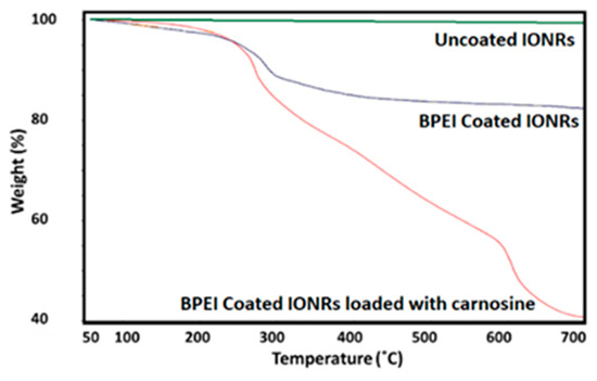 Thermal gravimetric analysis (TGA) analysis between 50 and 700 °C of uncoated IONRs (green), IONR capped with BPEI (blue) and capped IONR loaded with carnosine (red).
