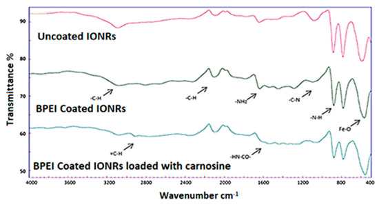 Fourier transform infrared spectra were acquired by FT-IR spectrum on the dry BPEI-coated IONR powder after checking a blank background.