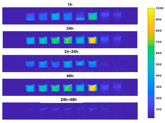 MRI measurements were performed at room temperature and used to measure T2 relaxation, to investigate the correlation between the relaxivity and sedimentation of the BPEI-coated IONRs. The colloidal stability, with respect to sedimentation, was observed via MRI in physiological solutions: 4-(2-hydroxyethyl)-1-piperazineethanesulfonic acid (HEPES), phosphate-buffered saline (PBS), fetal calf serum (FCS), Eagle’s minimal essential medium (MEM), Improved Minimal Essential Medium/Reduced-Serum (Opti-MEM®), Gibco™, Thermo Fisher Scientific, Waltham, MA, USA), and with distilled water at both pH 3 and 7. The IONR (50 µg/mL) were suspended into HEPES, PBS, FCS, MEM, Opti-MEM, distilled water (pH 3 and pH 7) and FCS combined with Opti-MEM (1:10 v/v) (200 µL) and transferred into a flat-bottom 96 well plate (with 10.67 mm depth × 6.86 mm top diameter × 6.35 mm bottom diameter wells). Images were collected at one-hour intervals over two days using a 1.5 T MRI scanner (Avanto, Siemens, Munich, Germany) with transverse slices centred on the 8 rows of wells in the 96 well plate. Images were acquired using a proton density weighted Turbo Spin Echo sequence (TR = 7.14 s and TE = 34 ms) with a 512 × 160 acquisition matrix and an isotropic resolution of 350 μm. An initial image was taken as a reference and was subtracted from the images collected at 1 h intervals to reveal any sedimentation. Where no sedimentation occurred, the resulting value was be zero (corresponding to dark blue) whereas any sedimentation (occurring after the reference image was collected) resulted in an increase in signal (corresponding to yellow through green coloured image).