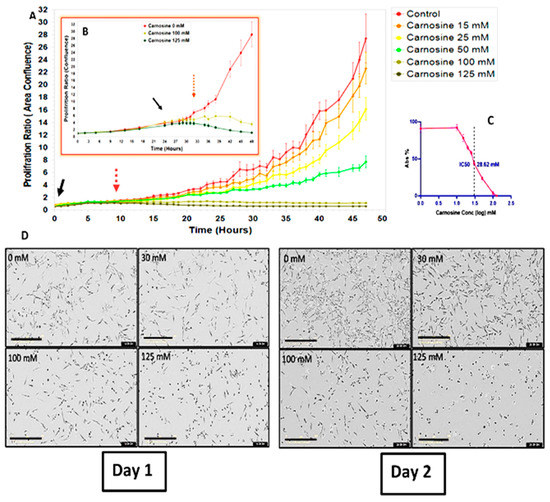 The U87 cells were imaged hourly during the 48 h exposure in complete culture media. The growth of U87 was relatively inhibited after 8 h and completely affected after 48 h when the applied carnosine reached ca. 125 mM. To confirm that this was not due to the cells being compromised in these wells, U87 cells were first seeded, and their proliferation was monitored for 24 h, before carnosine was added. Figure 6B clearly shows the suppression of U87 growth within 8 h after the addition of carnosine, which led to a complete growth inhibition and cell death after 2 days (Figure 6D). The half maximal inhibitory concentration (IC50) was determined after the MTT assay (a colorimetric assay for assessing cell metabolic activity) was performed, and was analysed using GraphPad Prism software (San Diego, CA, USA). A range of (23.6 to 34.7 mM) carnosine with a confidence level of 95% and a regression value of R2 = 0.8195 was found (Figure 6C). The effect of carnosine on U87 was clearly observed using phase contrast images of the cells with and without carnosine, using the IncuCyte® CytoLight Rapid green dye, while IncuCyte® Cytotox red reagent was used for real-time quantification of cell death. The number of live cells was shown to decrease while the number of dying cells increased in a dose-dependent manner.