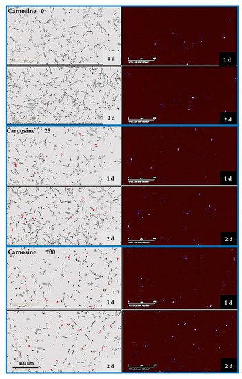 The analysis of the phase images and red channel enabled real-time evaluation of cell membrane integrity and cell death in response to carnosine exposure after 24 and 48 h (Figure 7). The maximal effective concentration curve was defined (EC50 = 28.2 mM).