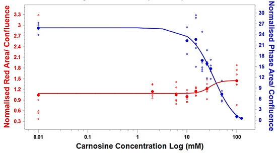 The red fluorescent areas with blue masks were quantified for different carnosine treatments using IncuCyte® standard analysis software. This was integrated with the previous proliferation test at (IC50 = 34 mM) (Figure 8). The plots representing live and dead cells initially showed no effect, followed by a cytostatic phase starting from 30 mM carnosine (Figure 8). However, the cell cytotoxicity could be seen to start immediately after the integration point. The mechanism of cell death is the effect of carnosine on the functionality of mitochondria, which lose the metabolic capability to develop the purple colour in the MTT assay and allow the red dye to penetrate. That accounts for the similarity of IC50/EC50 in the MTT, proliferation and cytotoxicity tests.
