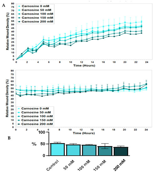 Carnosine affects migration and metastasis by suppressing the cells’ mobility regardless of the effect of proliferation [61]. The effects of the cell matrix and interactions in cell invasion mimic the cells during wound healing in vivo. Carnosine affects the invasions and metastases significantly when the concentration exceeds 50 mM (Figure 11).