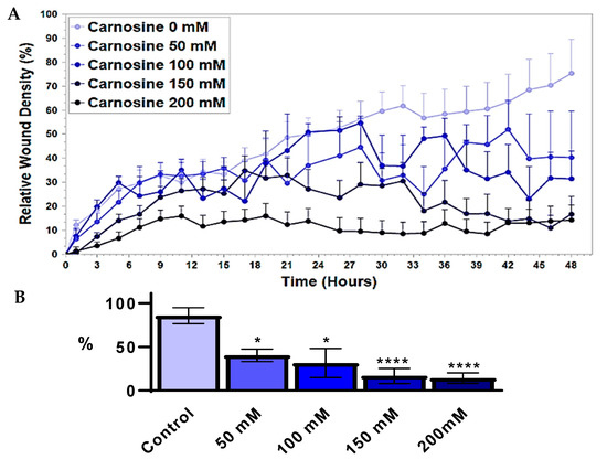 Effect of carnosine concentration on U87 cells’ wound healing by invasion over 48 h. (A) The same criteria as migration were applied to quantitatively address the effect of carnosine. (B) The statistical analysis shows a significant effect caused by carnosine (50 mM) at a cell density of 103 per well. The statistical significance level and indicated with (*) for p < 0.05, and (****) for p < 0.0001.