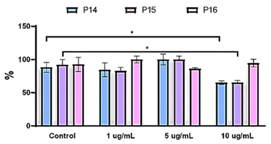 The quantitative MTT assay data shows that the viability of cells treated with BPEI-coated IONRs at concentrations of (0–10 µg/mL) did not display a significant statistical difference in one passage. However, two other passages showed cytotoxicity caused by IONRs at a concentration of 10 µg/mL. Hence, the surface modifications, which occur via positive charge (+19.14 mV) at pH 7, are safe to be applied on U87 cells using BPEI-coated IONRs concentrations of less than 10 µg/mL for an exposure period of 48 h (Figure 12). The effect of BPEI-coated IONRs is nonselective, and an MTT assay was applied for comparison. U87MG cells were grown in serum-free medium supplemented with dibutyryl cyclic adenosine monophosphate (dbcAMP; 0.3 mM) and B27 Supplement (1% v/v). The IONRs showed less effect on the metabolism of the differentiated U87 cells [62]. However, it was not a significant difference (Figure S10). In fact, astrocytes harbour protective mechanisms including neurotrophic factors and anti-oxidative stress molecules [63,64].