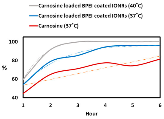 LC-MS assay for the released carnosine from dialysis membranes containing free or loaded BPEI-coated IONRs, under different conditions, at temperatures of 37 °C and 40 °C. The release of the embedded carnosine was enhanced exponentially in all conditions. Mild hyperthermia allowed the carnosine to be fully released between 3 and 5 h.