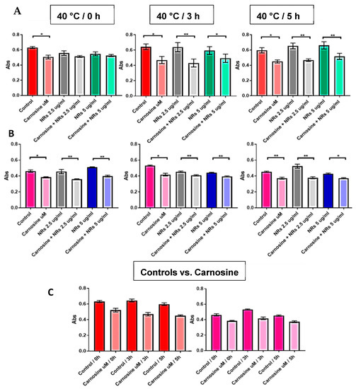 MTT assay on U87 cell line with same carnosine concentration 25 mM (A) carnosine loaded BPEI-coated IONRs and mixed for 5 min with the media (B) BPEI-coated IONRs added to the soluble carnosine in the media. In both cases, mild hyperthermia was applied. Comparing the controls shows the inefficiency of mild hyperthermia in killing cells because of the insignificant difference between the controls in all plates. The heat released the carnosine from the BPEI-coated IONRs after 3 to 5 h when it was bonded, while the effect was equal, without any significant difference, when the nano-rods existed in the same vicinity. Each treatment was repeated on 6 samples, then the T test was applied to address the significant changes. (C) Comparison of the repeatability of all controls from (A,B). (Abs = absorbance at 570 nm). The statistical significance level and indicated with (*) for p < 0.05, (**) for p < 0.01.