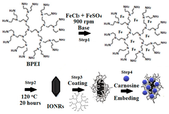 The synthetic route to embed carnosine within an IONR-functionalised carrier is illustrated in (Scheme 1). Branched polyethyleneimine polymer (BPEI), with its high density of cationic amino functional groups, dendritic structure, and inherent interstitial voids, was selected as a soft template for the IONRs [15]. In step one of the synthesis, the ferrous and ferric iron precursors were loaded into the polymer template before the addition of ethylenediamine, resulting in the co-precipitation of Fe3O4. The template was then removed, in step 2, via thermal degradation in a sealed reaction vessel (120 °C, 20 h), and the IONRs were washed with dry dimethyl formamide to avoid aggregation. TEM, FTIR and powder X-ray diffraction (XRD) studies confirmed that the IONRs were (85.9 ± 17.1 × 19.1 ± 1.8 × 11.3 ± 2.1 nm) Fe3O4 nanoscale crystals (Figure 1 and Figure S2A,C).