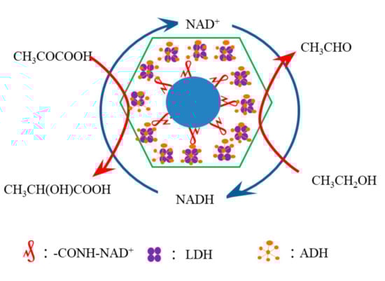 In our research, the schematic diagram of the experimental mechanism is shown in Figure 4. This experiment was based on the following principles: the coenzyme was immobilized on the nano silica carrier by silane APTES modification and carboxylation modification. Under the action of accelerant, carboxyl group combined with inactive site of coenzyme to realize the immobilization of coenzyme and form MSN-NAD+. Then ADH, MSN-NAD+, and LDH were synthesized by in-situ polymerization in aqueous solution ZIF@ADH/NAD-MSN/LDH. ADH was a zinc-containing metalloenzyme with a wide range of substrate specificity. ADH used nicotinamide purine dinucleotide (NAD) as coenzyme to catalyze the reversible reaction between primary alcohols and aldehydes. ADH was a kind of NAD-dependent kinase, which had three subunits of LDHA, LDHB, and LDHC, and could form six kinds of tetramer isozymes. ADH was also a zinc-containing metalloenzyme. According to the difference of binding coenzymes, they were divided into two categories: NAD-dependent lactate dehydrogenases (nLDHs) and NAD-independent lactate dehydrogenases (iLDHs). NAD-dependent lactate dehydrogenases could use NADH as a cofactor to catalyze the reduction of pyruvate to lactic acid and oxidize NADH to NAD+. The catalysis of ADH and LDH made the continuous conversion of NAD+ and NADH to realize coenzyme redox regeneration and multi enzyme cascade [55].