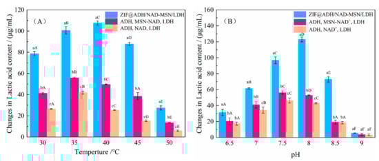 The catalytic reaction rate of enzyme was related to temperature and pH value. When the reaction conditions were too extreme, the catalytic efficiency of the enzyme will be greatly reduced [65]. In this study, the production rate of lactic acid was used as an indicator, and the stability of the co-immobilized enzyme was measured and compared with the free enzyme. As shown in Figure 6A, the lactic acid production rate of co-immobilized enzyme significantly increased at 35–45 °C, with the optimum temperature at 40 °C. Moreover, the conversion of lactic acid was 2.82 times higher than that of free enzyme. Compared with another two groups, ZIF@ADH/NAD-MSN/LDH showed higher thermostability, which might be attributed to the enhanced rigidity of the protein secondary structure [7]. Enzyme catalytic reactions are easily affected by thermal inactivation of enzyme proteins. After exceeding the optimal reaction temperature, the concentration of lactic acid in the three experiments all decreased as the temperature increased. However, the production rate was still higher than that of the two control groups. It indicated the co-immobilized enzyme could be used in a wider temperature range.