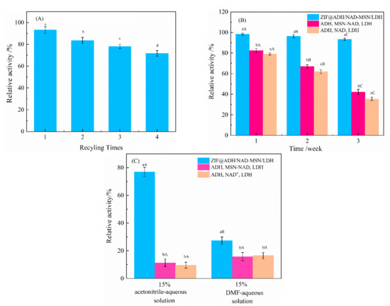The experimental results are shown in Figure 7A. The first relative recovery was 93.16%. After four reuses, the relative recovery could still reach to ~71.67%, indicating the good stability of the polymer. The loss of enzyme activities may occur as follows: (1) The centrifugal recovery of ZIF@ADH/NAD-MSN/LDH resulted in enzyme leakage and reduced enzyme activity [69]. (2) The acetaldehyde catalyzed by ethanol would affect the stability and catalytic effect of the enzyme in the circulation system. (3) The efficiency drops majorly resulted from the inevitable polymer weight loss in the separation from the reacting suspension [69]. It can be seen from Figure 7B that as the storage time increased, the enzyme activity under the system showed a gradual decline. However, the enzyme activity of ZIF@ADH/NAD-MSN/LDH remained at the initial 93.45% after three weeks, with almost no activity loss. The other two groups of free enzymes lost about 60% and 65% of their activity after three weeks. These results highlighted the excellent protective effect of MOF on enzyme.