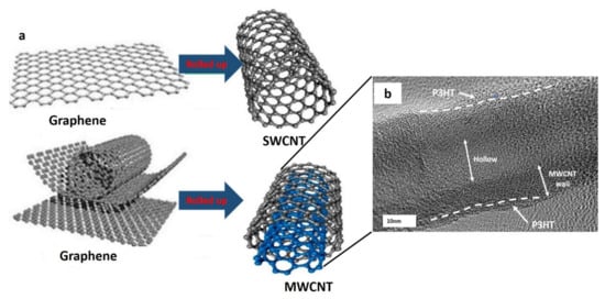(a) Schematic diagram of SWCNT and MWCNT (reproduced from []) and (b) the MWCNT wrapped with poly(3-hexylthiophene). Reproduced from [].