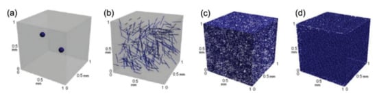 A significant amount of research has been directed toward the fabrication of CNT- reinforced polymer composites for functional and structural applications [,,]. Referring to Ma et al. [], however, the potential for using CNTs as reinforcements has been greatly restricted due to difficulties associated with entangled CNT dispersion during processing and poor interfacial interaction between CNTs and polymer matrix (Figure 3). The limits to dispersing CNTs differ from those of other conventional fillers such as spherical particles and carbon fibres because CNTs have nanometer-scale properties with aspect ratios greater than 1000, resulting in an exceptionally large surface area. Figure 2 depicts a schematic representation of the 3D distribution of micro-and nanoscale fillers in a polymer matrix, which demonstrates the strong influence of particle size and geometry on the varied distribution behaviour of particles in the matrix. The distribution of micro-scale fillers is homogenous throughout the matrix, as shown in Figure 2a,b, and a differentiation between individual particles in a matrix can be easily created. When CNTs are filled into the same volume of matrix system, however, it is difficult to disperse individual particles equally, as shown in Figure 2c,d. Besides that, a large surface area of nano CNTs means a large interface or interphase area present between the filler and the matrix.