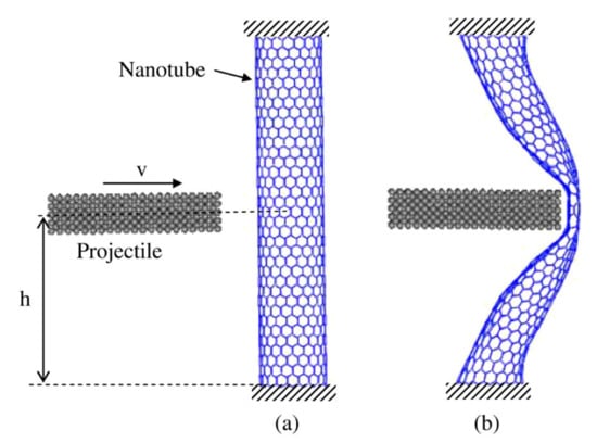 The molecular dynamics model of a CNT subjected to ballistic impact. (a) Initial model, (b) a deformed (18, 0) nanotube at its maximum energy absorption. Reproduced with permission from []. Copyright IOP Publishing, 2007.