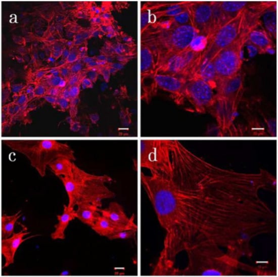 Fluorescence photomicrographs of cell cultures on (a,b) PET reinforced collagen sheets and (c,d) MWCNTs blocks. Reproduced from [].
