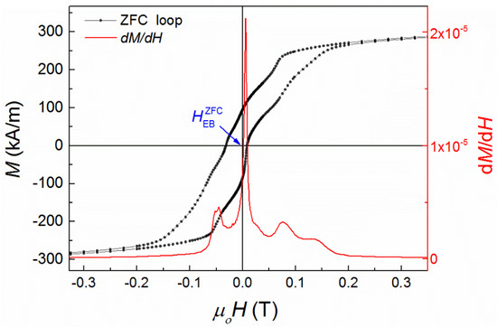 The field cooling (FC) hysteresis loop (Figure 1) was recorded at 5 K after cooling down under a field of 1 T from 400 K, well above Tc of the austenite phase, where the sample is in its paramagnetic phase. It should be stressed that for the zero-field cooling (ZFC) measurements, in order to achieve real and accurate zero-field conditions during the cooling process from 400 K to 5 K, the superconducting magnet was quenched to eliminate any residual superconducting currents, which could result in a small residual field during the ZFC measurements. Finally, the maximum sweeping field of the hysteresis loop at 5 K was 2 T. The FC loop was shifted along the negative field axis, thus indicating the existence of exchange bias, with an exchange bias field μο = 0.0175 T. It is known that EB is a phenomenon which develops at the interfaces between an AF and a FM region, thereby requiring the coexistence of AF and FM phases (or alternatively a spin glass state), which, in the case of a single-phase Ni–Co–Mn–Sn Heusler alloy, can be realized through the formation of AF and FM domains created by the interplay between FM and AF interactions due to the anti-site disorder. Since there are no indications of the formation of a secondary structural phase, we conclude that both magnetic phases, AF and FM, coexist as magnetic domains in the same structural substance (Ni–Co–Mn–Sn alloy).