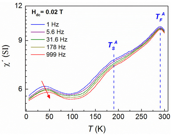 It is well known that the temperature dependence of the AC susceptibility peak provides significant information about the nature of the magnetic interactions of a glassy system. For this reason, AC measurements at various frequencies (f) were carried out in zero (DC) field cooling mode, starting from 400 K, which is above Tc of the austenite phase. The AC field was 0.2 mT for all measurements. The real part of the AC susceptibility (Figure 4) showed the same features as those of ΖFC DC magnetization measurements recorded with a heating ramp at 0.004 T (Figure 3). Particularly the asymmetric peak around 336 K indicates the martensitic transition (335 K–265 K), which is followed, at higher temperatures (T > 336 K), by the paramagnetic transition of the austenite phase at the Curie temperature (Tc = 350 K). At lower temperatures, there is a very broad peak around 220 K (TAC) which decays towards 5 K (Figure 4) and corresponds to the ZFC curve of the DC magnetization measurements at 0.004 T shown in Figure 3. Actually, this peak displaces to higher temperatures with increasing frequency. The dependence of the relaxation times on the peak temperatures exhibits an exponential behavior, but fittings to both Néel–Arrhenius and Vogel–Fulcher–Tammann models, for non-interacting or weakly interacting particles, respectively, yield unphysical values.