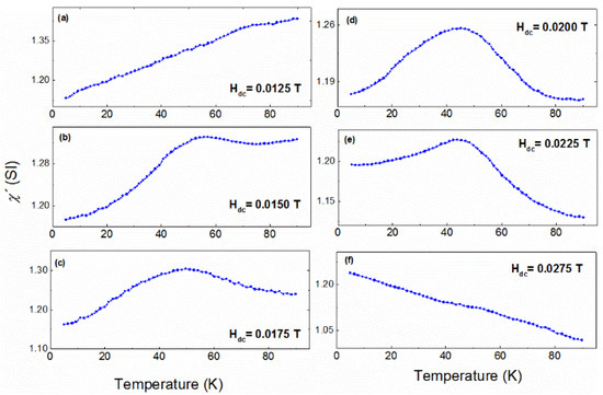 To verify this conclusion, similar AC susceptibility measurements were performed at a fixed frequency of 178 Hz while varying the DC bias field (0.0050 T < HDC < 0.0350 T). The aim of these measurements is to manipulate the size of the clusters and check its influence on the AC susceptibility. Indeed, as observed in Figure 6, the peak of the AC susceptibility measurements, around 42 K, progressively increases as the DC field increases from 0.0100 T to 0.0200 T and is also progressively decomposed at higher fields from 0.0200 T to 0.0350 T.