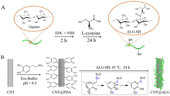Dopamine tends to self-polymerize under an alkaline environment. When CNT and dopamine are mixed together in a buffer solution with a pH value of 8.5, dopamine will self-polymerize, and PDA layers will be formed on the surface of CNT. The PDA molecule contains a quinone structure, and can react with thiol groups (–SH) under mild conditions easily and efficiently [24,31], which was dubbed a kind of click-chemistry [32]. Therefore, when ALG-SH was mixed with CNT@PDA, the quinone units will react quickly with thiol groups of ALG-SH, and thus, ALG molecules were successfully grafted on the surface of CNT, forming CNT@ALG (Figure 1).