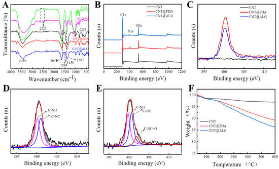 (A) FTIR spectra of ALG, ALGSH, CNT, CNT@PDA, CNT@ALG; (B) XPS spectra of CNT, CNT@PDA, CNT@ALG; (C) XPS spectra of N1s of CNT, CNT@PDA, CNT@ALG; (D) High-resolution XPS spectra of N1s of CNT@PDA; (E) High-resolution XPS spectra of N 1s of CNT@ALG; (F) TGA curves.