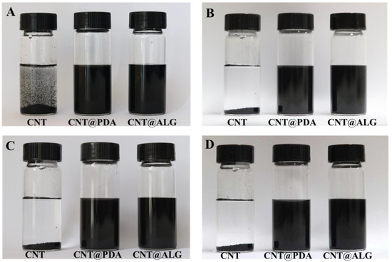 CNT have great potential applications as nanofillers in polymer composites. However, the mechanical properties of the reinforced polymer composites are always far below their expected theoretical values. The deficiency in the properties of polymer composites is related to the difficulty of obtaining the good dispersion of nanofillers. An efficient way is to modify the nanofillers with polymers and increase the phase compatibility between nanofillers and polymers. Herein, the CNT can entangle in bundles even at very low concentrations (Figure 4A), which is a great drawback for its application in polymer composites. However, due to the presence of PDA or ALG on the surface of CNT, the hybrid CNT@PDA and CNT@ALG can disperse well (Figure 4B,C). These results were in accordance with the dispersion test, demonstrating that the grafting of ALG on the surface of CNT may greatly change its surface properties. This change may tune the phase interaction between CNT and other polymer matrices, and thus may make CNT@ALG a novel filler to reinforce polymers and improve their mechanical properties. Generally, it has been a common method to graft hydrophilic polymers, such as PEG-based polymers [37] and gelatin [26], on the surface of CNT to improve its dispersion state. Thus, we are sure that the prepared CNT@ALG has great potential in polymer composites and realizes the improvement of mechanical properties, which may broaden the application of CNT in reinforced nanocomposites.
