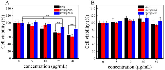 Cell viability of MC3T3-E1 cells (A) and HepG2 cells (B) cultured in suspensions of CNT, CNT@PDA, CNT@ALG at different concentrations. (n = 5), * p < 0.05, ** p < 0.01.