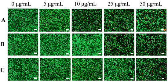 AO/EB staining was used to detect the apoptosis of MC3T3-E1 cells. An amount of 1 mL DMEM with 10% (v/v) FBS containing MC3T3-E1 cells at a density of 8 × 104 cells/mL was seeded into a 24-well plate (containing the dish climbing glasses) and incubated at 37 °C under an atmosphere of 5% CO2 for 24 h. Subsequently, the culture media was replaced with 1 mL of fresh medium containing samples at various concentrations of 5, 10, 25, 50 µg/mL. After 24 h co-incubation, fresh medium was used to replace the old medium to wash each well several times, and then AO/EB reagent was added to each well for 30 s. Finally, the survival of cells was observed by Fluorescence microscopy.