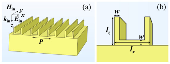 The designed 3D metamaterial is schematically depicted in Figure 1a. The array of Au VSRRs is directly on the Au substrate. Figure 1b shows the magnified front view of a unit cell of the Au VSRRs structure. The structural parameter of an individual VSRR: lx = lz = 90 nm and w = 20 nm. The periodicity P along x direction is set as 800 nm. The electric field Ein, magnetic field Hin and wave vector Kin of the incident light are along the x, y, and z axes, respectively. Our proposed Au VSRRs structure is able to be achieved experimentally by the following process: Firstly, a thick Au film with a thickness of 100 nm is deposited on a glass substrate. Then, the Au VSRRs array is prepared by electron beam lithography with the double exposure process. We employ the commercial software package “EastFDTD, version 5.0” based on the finite-difference time-domain method to numerically simulate the plasmonic resonant behaviors of our designed Au VSRRs structure. In the z axis direction and the x axis direction, perfectly matched layers and periodic boundary conditions were applied, respectively. The permittivity of Au was calculated by using the Drude model [43] with the plasma frequency of ωp = 1.37 × 1016 s−1 and the damping constant of ωc = 4.08 × 1013 s−1.