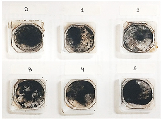 The procedures for coating Fe3O4 samples with Pluronic surfactants (Figure 2) were performed, according to the procedure, as follows: (1) solutions at different concentrations of Pluronic F-127 were prepared (Table 1); (2) a 10 mL aliquot was taken from each solution and added to the aqueous NH4OH solution (1.28 mol L−1); (3) the basic solution was heated to 80 °C on a heating plate for 10 min; (4) the iron salt solution was added to the Pluronic F-127 (Sigma-Aldrich, St. Louis, MI, USA) solution under vigorous stirring, using a nonmagnetic spatula; (5) a black precipitate product was immediately observed, indicating the formation of NPs; (6) the NPs were kept in an ultrasound bath for one hour to prevent agglomeration; (7) the same procedure used for washing MNPs was performed for the samples coated with Pluronic F-127. After these procedures, we could observe the NPs (Figure 3), that were stored at approximately 20 °C.