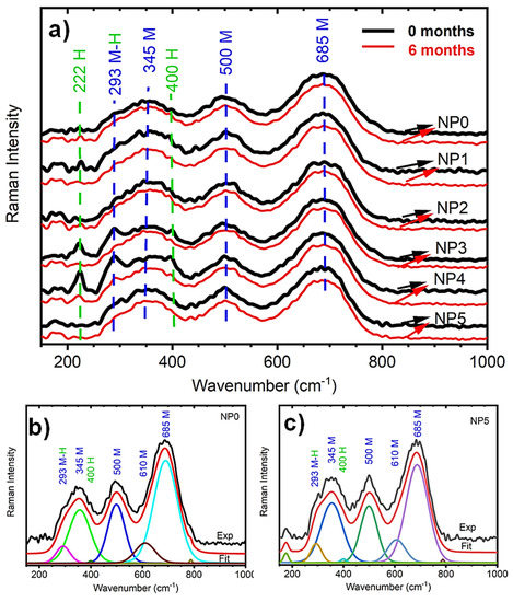 Raman measurements (a) taken at 0 and 6 months after synthesis for each sample obtained with a laser power of 20 mW, in which the spectral characteristic bands are predominant in the magnetite phase (a). Deconvolution of the Raman peaks for samples NP0 (b) and NP5 (c), in which we extracted the data for Table 5.