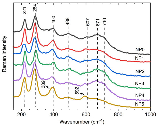 The Raman spectra obtained with a power of 50 mW for the same samples revealed the presence of Raman peaks at 221, 284, 400, 488, and 607 cm−1 (see Figure 5). These values are typical of α-Fe2O3 and are in accordance with the literature [22,39,41,42,43]. Peaks at 671 and 710 cm−1 were also observed and according to the literature, the appearance of these peaks in the hematite phase may be related to the nanometric size of the particles [41,42,44]; such activation shows that the disorder of the nanomaterial surface induces the phonon scattering symmetry breaking [45], which explains why this peak is not always observed in the spectra. In addition, the 400 and 607 cm−1 vibrational modes show a gradual softening with increasing percentage of Pluronic surfactant, indicating the presence of Pluronic bound to the MNPs.