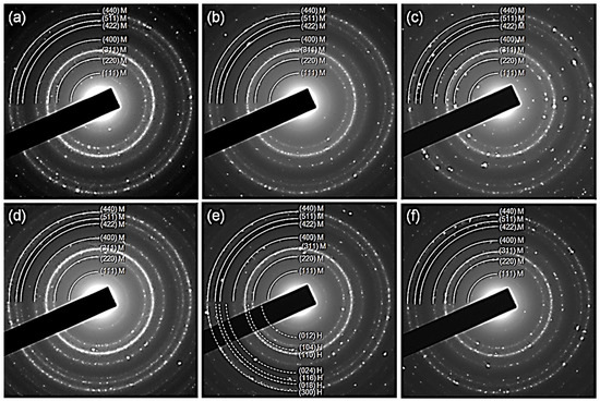 Electron diffraction (ED) patterns of the samples (a) NP0, (b) NP1, (c) NP2, (d) NP3, (e) NP4, (f) NP5. M: magnetite, H: hematite.