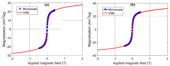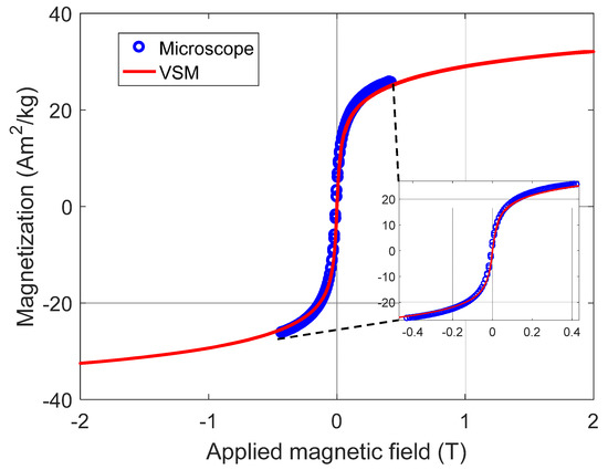 This same NP0 sample was measured in a commercial Quantum Design PPMS (model VersaLab), where the measurements were made in vibrating sample magnetometer (VSM) mode. The comparison between the two measurements is shown in Figure 13. The curve composed of blue circles resulted from the measurement obtained by SMM at PUC-Rio and the continuous curve, in red, is the measurement made by VSM, showing a good agreement with each other. The average diameter of the MNPs could also be estimated. Although there is a size distribution, as observed in the TEM images, for this estimate, all particles were considered as having the same size, disregarding any interaction. In this case, the Langevin equation was used, making a first-order approximation to low magnetic fields [47,48]. That is: