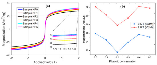 Magnetization measurements (a) of the six samples by VSM. The inset shows the saturation region, close to a magnetic field of 2 T. (b) Values of saturation magnetization versus Pluronic consent.