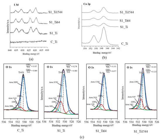 XPS narrow spectra of I 3d and Ca 2p were obtained on the Ti and its alloy samples (S1_Ti, S1_Ti64, and S1_Ti1544) with maximum iodine contents that were introduced by soaking in 10 mM ICl3 at 80 °C following NaOH-CaCl2 heat treatment. They exhibited two pairs of split I 3d peaks that were approximately 619 and 630 eV, and 623 and 635 eV in binding energy (Figure 1a). The former pair is attributed to the negatively charged iodine (NIST XPS data base Version 4.1: 7681-82-5), whereas the latter pair is attributed to the positively charged iodine (NIST XPS data base Version 4.1: 10450609). Interestingly, the positively charged iodine peak intensity gradually decreased in the course of the measurement process, while the negatively charged iodine peak intensity was the opposite (Figure S1). This indicates that a portion of the positively charged iodine transformed into negatively charged iodine under irradiation with an electron beam during the course of the measurement. The treated samples also showed split peaks of approximately 347 and 350 eV, which are attributed to the Ca 2p3/2 and Ca 2p1/2 of CaO, respectively (NIST XPS data base Version 4.1: 1305-78-8), and their intensities were less than that on Ti as NaOH-CaCl2 heat treatment (Figure 1b). The fitting profile of O1s shows that both the acidic and basic Ti-OH groups appeared abundantly on the treated Ti and alloys compared with those on Ti with NaOH-CaCl2 heat treatment (Figure 1c).