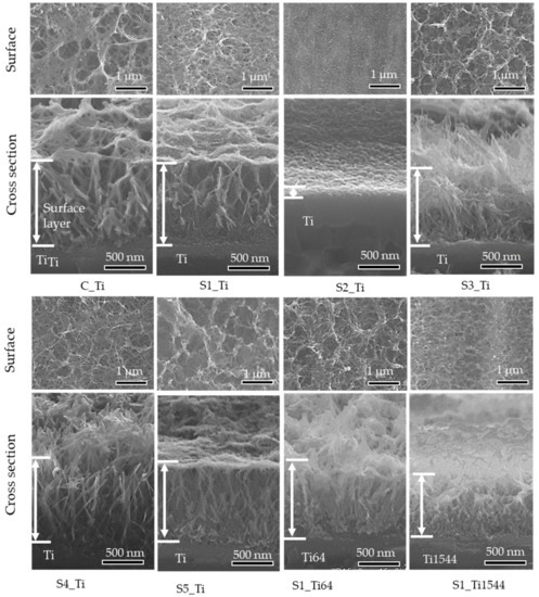 Nanostructured surface layers composed of calcium titanate and rutile that were approximately 1 μm thick were produced on Ti and alloy samples by NaOH, CaCl2, and heat treatment, as reported in our previous study [43,44].