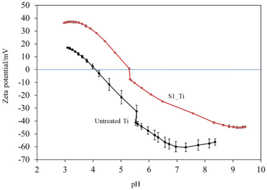 Figure 4 shows the zeta potential titration curves of the untreated and treated Ti samples (S1_Ti). The isoelectric point (IEP) of the treated surface was approximately 5.3 (close to the pH value of the KCl electrolyte at the beginning of the acid/basic measurements). At this pH, the net electrokinetic charge of the surface becomes null.