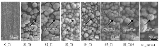 To impart bone-bonding capacity to Ti and its alloys, various surface modifications, including plasma spray-coating, sputtering, and sol-gel or alternative soaking, have been used to provide a coat of apatite or other calcium phosphates [3,4]. Alkaline or acidic solution and heat [5,6], blasting [7], hydrothermal treatment [8], ion implantation [9], and anodic oxidation [10] have also been examined. These studies revealed a roughened surface on the micro- and nanometer scales, and their hierarchical arrangement enhanced preosteoblast cell activity, including proliferation, differentiation, and gene expression [11,12,13,14]. An apatite coating or providing Ti and its alloys with apatite formation capacity induced direct bone bonding in a short period of time [15,16].