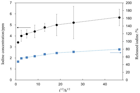 Iodine concentration released from S1_Ti as a function of the square root of soaking time in PBS. The percentage of released iodine from S1_Ti was calculated from the iodine concentration in PBS and iodine amount remaining on the metal after the ion release test.