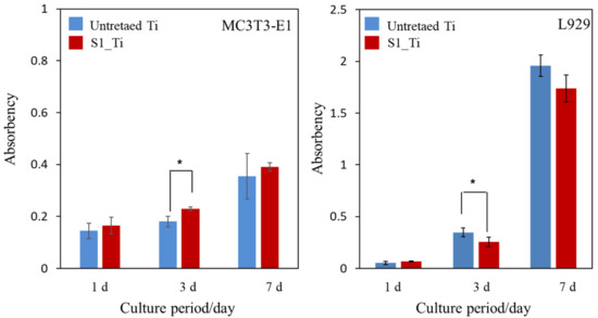 The MC3T3-E1 and L929 cell proliferation on the treated sample (S1_Ti) during the culture periods for up to 7 days of incubation time was assessed and compared with that of untreated Ti, as shown in Figure 9. At all of the culture period time points except 3 days, the MC3T3-E1 and L929 cell proliferation on the treated Ti was comparable to that on untreated Ti. On day 3, a significant increase in MC3T3-E1 and decrease in L929 was detected on the treated Ti.