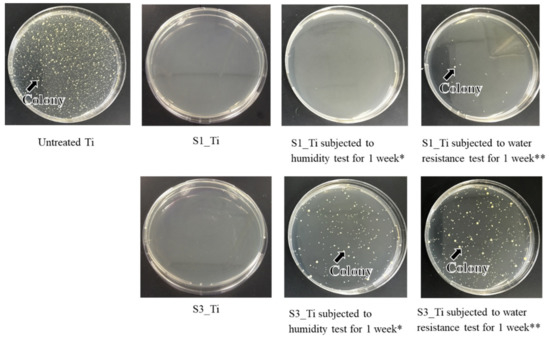 The antibacterial activity and its short-term stability in the Ti samples treated with higher and lower iodine contents on their surface were evaluated according to the ISO 22196 standard: S1_Ti with 8.6% and S3_Ti with 2.3% of iodine. Figure 10 shows that both of the treated Ti samples exhibited no colony formation, indicating potent antibacterial activity (reduction rate > 99%). This potent antibacterial activity remained for 1 week for S1_Ti, even after the humidity or water resistance test for 1 week in which no or only a scant amount of colony formation occurred. By contrast, some amount of colony formation occurred for S3_Ti with 2.3% iodine after the humidity test, and a larger amount was observed after the water resistance test, although these amounts were still lower than those for the untreated Ti.