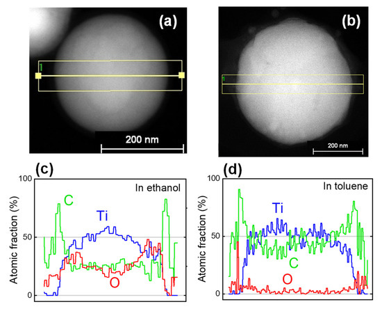STEM images of TiC SMPs fabricated via PLML (a) in ethanol and (b) in toluene. The laser irradiation conditions were 532 nm Nd:YAG laser at 150 mJ pulse−1 cm−2 for 10 min in ethanol and 120 min in toluene. Compositional line scans of corresponding single particles obtained (c) in ethanol and (d) in toluene.