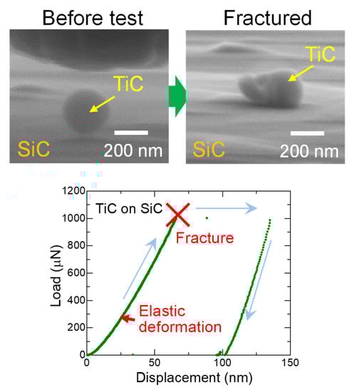 Figure 4 shows a typical fracture process of TiC SMPs on a SiC substrate using a diamond indenter with SEM images before and after the test. A clear jump of displacement induced by a fracture is observed in the load–displacement curve. Figure 5 shows the particle size dependence of fracture strength for TiC SMPs obtained using the Hiramatsu–Oka equation [18,19,20].