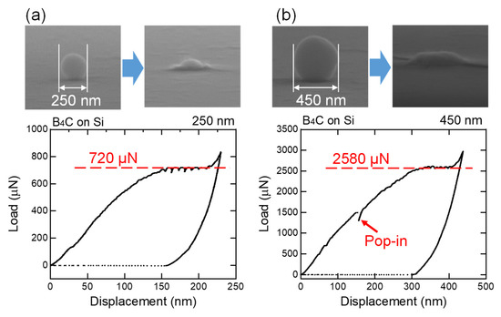 Figure 10 shows the load–displacement curve of the particle embedding process for 250 and 450 nm B4C particles into Si single-crystalline substrates with SEM images before and after the load application. Nearly the entire particle was embedded after the load application, and only the top part of the particle can be observed after embedment. Plateau ranges in the load–displacement curves began when the displacement exceeded half of the particle size, suggesting the embedding process described in Figure 9c. The load at the plateau was larger for larger particles. For larger particles, a pop-in process, as in the case of 450 nm indented particles, is sometimes observed, indicating discontinuous embedment by crack formation of the particles [26].